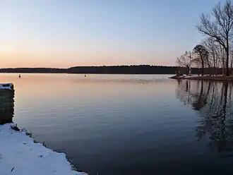 The Seddinsee is a lake in the south-eastern outskirts of Berlin, the capital city of Germany. It is aligned south-west to north-east, with its south-western end adjacent to the Berlin suburb of Schmöckwitz. Here, the Seddinsee meets the Zeuthener See and Langer See, two lakes that form part of the course of the River Dahme.