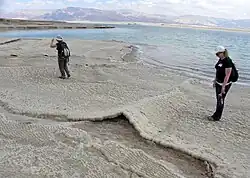 Antidunes are the sediment[2] bedforms created by fast, shallow flows of water with a Froude number greater than 1. Antidunes form beneath standing waves of water that periodically steepen, migrate, and then break upstream. The antidune bedform is characterized by shallow foresets, which dip upstream at an angle of about ten degrees that can be up to five meters in length.[3] They can be identified by their low angle foresets. For the most part, antidunes bedforms are destroyed during decreased flow, and therefore cross bedding formed by antidunes will not be preserved.[4][5]