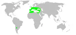 Originally a species of the Mediterranean region as far east as Georgia, it can now be found in many towns in southern Britain, where they were probably introduced via seaports at least since 1845.[3] It has been found in several places in Cornwall, South Molton (North Devon) ,Shaftesbury, Torbay, Bradninch (Mid Devon), Jersey, Plymouth, Bristol, North Somerset, Swindon, Gloucester,[6] Ashford, Folkestone, Deal, Dover, Hayes, Southampton, Salisbury, Whitstable, Canterbury, South East London, Vinters Park, Maidstone, Portsmouth, Exeter,[7] Sittingbourne, Isle of Sheppey, Essex, Faversham, Tonbridge, Hitchin,[8] Sheffield, Bridgwater[9] and Newport,[10] where it prefers south-facing walls.[11] Specimens have been found in Exeter Cathedral as far back as 1890.[12][13] In 2023, it was reported that a population was established in Limerick in western Ireland.[14] It has also been found in Argentina, Australia and several Atlantic islands, where it was probably also introduced. One specimen has also been observed in Leiden, The Netherlands.
