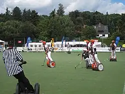 Segway polo is similar to horse polo, except that instead of playing on horseback, each player rides a Segway PT on the field. The rules have been adapted from bicycle polo and horse polo. Two teams of five players each hit a ball with their mallets, trying to get the ball into the other team's goal. The regulation field size is 200 by 128 feet (61 by 39 meters), and the goal is 8 feet (2.4 meters) wide by 5 feet (1.5 meters) high. A regulation match consists of four 8 minute quarters, known in polo as "chukkers." The ball can be struck with the mallet or any part of a player's body or Segway but may only be directed using the mallet. A goal can not be scored off of any part of a player's body or Segway unless it occurs accidentally. First played in 2003.[2]