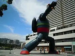 In 2009, a life-size RX-78-02 Gundam was installed in Odaiba, and within 52 days of its opening to the public, the number of visitors was estimated as over 4 million.[35] In October of the same year, a giant statue of the robot from Tetsujin 28-go was unveiled outside Shin-Nagata Station, Kobe, in honor of hometown mangaka Mitsuteru Yokoyama.[36][37] The Unicorn Gundam statue which replaced the RX-78 in 2017 appeared in the route of the Triathlon at the 2020 Summer Olympics.[38] Another full-scale Gundam was constructed for Gundam Factory Yokohama in Yokohama Bay and opened December 2020, with moving limbs and a ticketed observation deck, making it the first attraction of its kind.[39] The facility closed March 31, 2024, after a drone and firework show.[40]