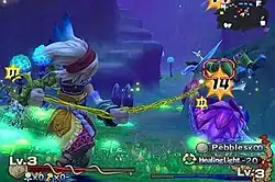 The combat system in Dawn of Mana is called the Mono system, based around the Havok physic engine. Almost all objects in the game, including enemies, are moveable, allowing Keldric to throw objects at enemies, or even throw other monsters.[5] Keldric can either throw objects in the direction he is facing, or can target a specific enemy or object to aim at them. When something is thrown near an enemy, they Panic, resulting in a counter over their head that counts down to zero to end the Panic. While panicked, enemies take more damage from attacks and spells.[4] Defeating enemies when they are panicked gives the player two types of medals, which can either boost the player's health and attack damage, or mana and magic damage.[3] Throwing multiple objects can Panic enemies more; when the Panic meter is greater than 99 the player can receive better medals.[6] Defeating enemies also grants experience points, which raise Keldric and Faye's level up to a maximum of four, granting higher health, mana, and damage, and granting new spells and attacks.[4][7] In addition to being throwable, many objects in the game are also destructible.[4]