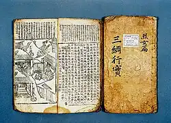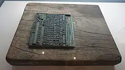 Sejong's reign was a high point in innovations in Korean movable type technology.[115][116][117] In 1420, Sejong ordered the casting of new kyŏngja types (경자자; 庚子字[118]). The previously used kyemi types (계미자; 癸未字) required the use of adhesive beeswax to secure type to plate; this process was laborious and slow. The kyŏngja types instead relied on faster mechanical methods of typesetting, and allowed multiple times more pages to be printed per day.[116][119][120][121] In 1434, Sejong's court cast a set of more than 200,000 kabin types (갑인자; 甲寅字[122]) that were made of copper.[104][116][123][119][124] The kabin types were as twice as efficient to use as kyŏngja types.[125][124] Kabin type were manufactured five,[126] six,[124] or seven[120] additional times in the future. After 1437, lead types began to be used.[116] The use of such types was also regulated. Punishments were established for mistakes and poor worksmanship.[127]