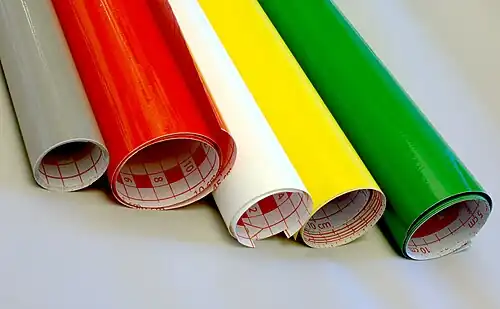 Since the 1980s, the vinyle films are typically cut on a computer-controlled plotter (see vinyl cutter) or printed in a wide-format printer. These sheets and films are used to produce a wide variety of commercial signage products, vinyl wraps or racing stripes on vehicles for aesthetics or as wrap advertising, and general purpose stickers.[6]