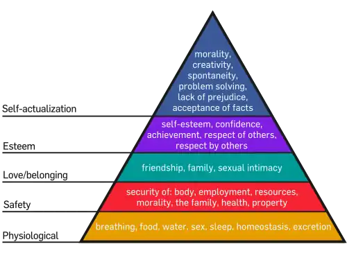 Many early theories suggested that self-esteem is a basic human need or motivation. American psychologist, Abraham Maslow included self-esteem in his hierarchy of human needs. He described two different forms of "esteem": the need for respect from others in the form of recognition, success, and admiration, and the need for self-respect in the form of self-love, self-confidence, skill, or aptitude.[26] Respect from others was believed to be more fragile and easily lost than inner self-esteem. According to Maslow, without the fulfillment of the self-esteem need, individuals will be driven to seek it and unable to grow and obtain self-actualization. Maslow also states that the healthiest expression of self-esteem "is the one which manifests in the respect we deserve for others, more than renown, fame, and flattery". Modern theories of self-esteem explore the reasons humans are motivated to maintain a high regard for themselves. Sociometer theory maintains that self-esteem evolved to check one's level of status and acceptance in one's social group. According to Terror Management Theory, self-esteem serves a protective function and reduces anxiety about life and death.[27]