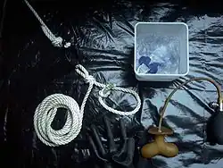 With rope, the main difficulty is tying the hands in a way that is not easy to untie. One common solution is to use a cinch noose — essentially a kind of slip knot — together with a coil (a loop of rope). The wrists are placed through the coil with the cinch noose between the wrists and around the coil. To achieve a basic hogtie position, the cinch noose is tied to the ankles. With pressure, the noose tightens the wrist coil, securing the hands. It proves very difficult to escape from, and usually a knife or scissors is required to cut free.