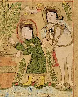 167. ^ a b Shahbazi, Shapur (30 August 2020). "Clothing". Encyclopaedia Iranica Online. Brill. Nevertheless, the most distinctive feature of late Saljuq and post-Saljuq male dress was the popularity of patterned textiles for these garments. (...) That these patterns do not merely represent ceramic conventions is clear from the rendering of garments in fragmentary wall paintings and in illustrations from the copy of Varqa wa Golšāh already mentioned, as well as in frontispieces to the volumes of Abu'l-Faraj Eṣfahānī's Ketāb al-aḡānī dated 614–16/1217–19 and to two copies of Ketāb al-deryāq (Book of antidotes) by Pseudo-Galen, dated 596/1199 and ascribed to the second quarter of the 7th/13th century respectively (Survey of Persian Art V, pl. 554A-B; Ateş, pls. 1/3, 6/16, 18; D. S. Rice, 1953, figs. 14-19; Ettinghausen, 1962, pp. 65, 85, 91). The last three manuscripts, all of them attributed to northern Mesopotamia, show that the stiff coat with diagonal closing and arm bands was also worn in that region from the end of the 6th/12th century.
