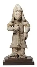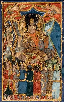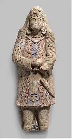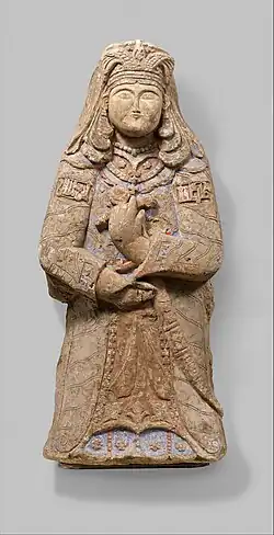 Enthroned figure usually identified as the last Seljuk ruler Tughril III (1176–1194), from Rayy, Iran. Philadelphia Museum of Art.[61][62]