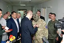 Semenchenko was also awarded with a department encouraging honour of the MoI ‘Firearm’ – nameplate weapon having the right to live carrying - Fort-17 pistol of domestic production.[34][35] During the official ceremony in the Regional Hospital of Mechnikov in Dnipropetrovsk visited by the acting Prime-Minister of Ukraine Arseniy Yatsenyuk, Semenchenko took off the balaklava in public for the first time.[36][37]