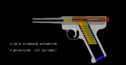 A semi-automatic pistol recycles part of the energy released by the propellant combustion to move its bolt, which is usually housed inside the slide. After a round of ammunition is fired, the spent cartridge casing is extracted and ejected as the slide/bolt moves rearwards under recoil, the hammer/striker is cocked by the slide/bolt movement, and a new round from the magazine is pushed into the chamber when the slide/bolt returns forward under spring tension. This sets up the following shot (i.e. "in battery"), which is fired as soon as the trigger is pulled again.[3] Most pistols use a short recoil operation to perform this, but some pistols use simple blowback or gas operation mechanisms.[4]