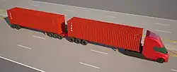 The maximum overall length in the EU and EEA member states was 18.75 m (61.5 ft) with a maximum weight of 40 or 44 tonnes (39.4 or 43.3 long tons; 44.1 or 48.5 short tons) if carrying an ISO container.[14] However, rules limiting the semi-trailers to 16.5 m (54 ft) and 18.75 m are met with trucks carrying a standardized 7.82 m (26 ft) body with one additional 7.82 m body on tow as a trailer.[15] 25.25-metre (83 ft) truck combinations were developed under the branding of EcoCombi which influenced the name of EuroCombi for an ongoing standardization effort where such truck combinations shall be legal to operate in all jurisdictions of the European Economic Area. With the 50% increase in cargo weight, the fuel efficiency increases an average of 20% with a corresponding relative decrease in carbon emissions and with the added benefit of one third fewer trucks on the road.[14] The 1996 EU regulation defines a Europe Module System (EMS) as it was implemented in Sweden. The wording of EMS combinations and EuroCombi are now used interchangeably to point to truck combinations as specified in the EU document; however, apart from Sweden and Finland, the EuroCombi is only allowed to operate on specific roads in other EU member states. Since 1996 Sweden and Finland formally won a final exemption from the European Economic Area rules with 60 tonne and 25.25-metre (83 ft) combinations. From 2006, 25.25 m truck trailer combinations are to be allowed on restricted routes within Germany, following a similar (on-going) trial in The Netherlands. Similarly, Denmark has allowed 25.25 m combinations on select routes. These vehicles will run a 60-tonne (59.1-long-ton; 66.1-short-ton) weight limit. Two types are to be used: 1) a 26-tonne truck pulling a dolly and semi-trailer, or 2) an articulated tractor unit pulling a B-double, member states gained the ability to adopt the same rules. In Italy the maximum permitted weight (unless exceptional transport is authorized) is 44 tonnes for any kind of combination with five axles or more. Czech Republic has allowed 25.25 m combinations with a permission for a selected route.