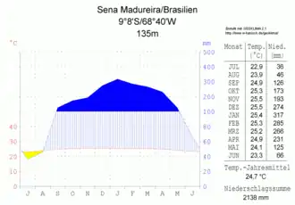 Sena Madureira (Portuguese pronunciation: [ˈsẽnɐ maduˈɾejɾɐ]) is a municipality located in the center of the Brazilian state of Acre. Its population is 46,511 and its area is 25,278 square kilometres (9,760 sq mi), making it the largest municipality in the state. It has a climate which combines temperatures of 78 °F (26 °C) with humidities in the upper 90s percent, all year round. It is 143 km from Rio Branco. The oldest church in Acre state is located in Sena Madureira, the Nossa Senhora da Imaculada Conceição Church (1910).