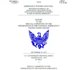 The Report of the Special Committee on the Termination of the National Emergency, also known as Senate Report 93-549, was a document issued by the "Special Committee on the Termination of the National Emergency" of the 93rd Congress (hence the "93" in the name) (1973 to 1975). Its purpose was to discuss and address the 40-year-long national emergency that had been in effect in the United States since 1933. During the continued emergency, Congress voted to transfer powers from itself to the President. The debate to end long-running national emergencies ended in 1976 with the National Emergencies Act (50 U.S.C. 1601–1651), which rescinded the president's authority under the prior emergencies[1][2][3] and established an expiration period (subject to annual presidential renewal) on future declared emergencies.