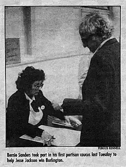 Paquette's loss was attributed to his own shortcomings, as he did not campaign or promote his candidacy since neither Sanders nor Bove was seen as a serious challenger. Sanders had not previously won an election.[63] Paquette was also considered to have lost because he proposed an unpopular $0.65 per $100 raise in taxes that Sanders opposed.[64] Sanders spent around $4,000 on his campaign.[65]