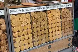 Senbei (煎餅), also spelled sembei, is a type of Japanese rice cracker.[1] They come in various shapes, sizes, and flavors, usually savory but sometimes sweet. Senbei are often eaten with green tea as a casual snack and offered to visiting house guests as a courtesy refreshment.