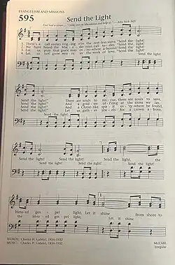 "Send the Light" is a hymn written in 1890 by American composer Charles H. Gabriel. The hymn was the first composed by Gabriel, who would later compose multiple famous hymns, such as "His Eye Is on the Sparrow" and "Will the Circle be Unbroken?".