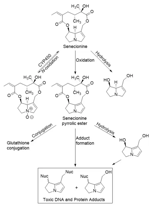In the toxic pathway, the 2-pyrroline in the core is desaturated via an oxidation reaction to form a pyrrolic ester. This metabolite can still subsequently be eliminated if it is conjugated to glutathione. However, this metabolite is toxic because it can act as an electrophile. It may be attacked by either DNA base pairs or by amino acid residues in liver proteins, resulting in the formation of toxic adducts, including cross-linked adducts between DNA base pairs, liver proteins, or both.[13] These adducts can damage DNA, leading to genotoxicity and carcinogenesis, and liver enzymes and hepatocytes, leading to hepatotoxicity.[6]