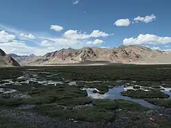 Sengge Zangbo,[1][2] Sengge Khabab[3] (Tibetan: སེང་གེ་ཁ་འབབ།, Wylie: seng ge kha 'bab) or Shiquan He (Chinese: 獅泉河; pinyin: Shīquán Hé) is a river in the Ngari Prefecture in the Tibet Autonomous Region, China that is the source stream of the Indus River, one of the major trans-Himalayan rivers of Central and South Asia. The river rises in the mountain springs north of the Manasarovar lake,[4] and 300 km (190 mi) downstream joins the Gar Tsangpo river near the village of Tashigang. Although it is thereafter called the Indus internationally,[5] the Tibetans continue to regard the combined river to be Sênggê Zangbo as it flows into Ladakh.