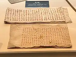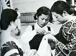 Senninbari were most commonly made from white cloth and embroidered with 1000 red stitches, as the combination of white and red was considered to be lucky and auspicious.[3] Yellow, red and green cloth were also used, and were combined with various coloured threads (such as yellow, gold, red and white) used for the embroidery.[1] The stitches were typically arranged in multiple rows, but were also arranged in formations creating patterns resembling images of flags, patriotic slogans, or tigers; the most common slogan stitched into senninbari was bu-un chō-kyū (武運長久) or "eternal good luck in war". Tigers stitched or painted onto senninbari were also common, as tigers were popularly known to be able to travel far away from home and return safely.[1]