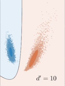 We may sometimes want to scale the discriminability of two data distributions by moving them closer or farther apart. One such case is when we are modeling a detection or classification task, and the model performance exceeds that of the subject or observed data. In that case, we can move the model variable distributions closer together so that it matches the observed performance, while also predicting which specific data points should start overlapping and be misclassified.