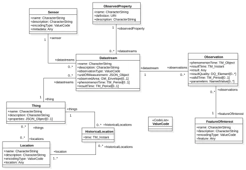 Thing: An object of the physical world (physical things) or the information world (virtual things) that is capable of being identified and integrated into communication networks.[8]Locations: Locates the Thing or the Things it associated with.HistoricalLocations: Set provides the current (i.e., last known) and previous locations of the Thing with their time.Datastream: A collection of Observations and the Observations in a Datastream measure the same ObservedProperty and are produced by the same Sensor.ObservedProperty: Specifies the phenomenon of an Observation.Sensor: An instrument that observes a property or phenomenon with the goal of producing an estimate of the value of the property.Observation: Act of measuring or otherwise determining the value of a property.[9]FeatureOfInterest: An Observation results in a value being assigned to a phenomenon.The phenomenon is a property of a feature, the latter being the FeatureOfInterest of the Observation.[9]