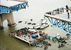 The original Seongsu Bridge was built by Dong Ah Construction Industrial Company, opening to the public on October 15, 1979.[2][1] The bridge spanned 1,160 meters (3,810 ft) and was 19.4 meters (64 ft) wide, accommodating 4 lanes of traffic.[3] Fifteen years later, on the morning of October 21, 1994, a span of the Seongsu Bridge collapsed, killing 32 people and injuring 17 others.[2] The collapse was ruled a result of poor welding, rusted extension hinges, and lack of general maintenance— and would result in the convictions of 16 city government and construction workers on charges of criminal negligence.[4]