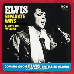 "Separate Ways" is a 1972 song by Elvis Presley written by Red West and Richard Mainegra. Elvis Presley recorded the song on March 27, 1972, and released it as a single with "Always On My Mind" as the B-side. It reached gold status in the US for sales of over half a million copies. It was listed as a double-sided hit reaching #16 on Billboard magazine's Hot Country Singles chart in November 1972.[1] In the UK "Always On My Mind" was the hit song and "Separate Ways" was the B-side.