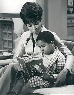 - Julia, described by one critic as "the first non-Negro-stereotype TV situation comedy to star a Negro actress",[59] premiered at 8:30 Eastern time on the NBC television network and began a three-season run. Actress and singer Diahann Carroll portrayed Julia Baker, a recently widowed black nurse, with Lloyd Nolan in a supporting role as Baker's white boss and Marc Copage as her 6-year-old son, Corey. Another child actor, Michael Link, appeared as Corey's white friend, Earl J. Waggedorn. Hal Kanter was the creator-producer of a show that was generally praised by television critics. One critic noted that the situation comedy "is very low pressure, admirably without a laugh track, and weaves in warmth, bite and a social needle... of course it must deal at times with black-white relationships, but it is not, and does not pretend to be, a social tract", adding, "It has been suggested by some that 'Julia' is not going to give a true representation of Negro life, and that may very well be so. On the other hand it might be argued that white situation comedies hardly give a true representation of white life in the United States. This may not be anything to cheer about overall, but it seems unfair to expect 'Julia' to solve all the world's problems."[60] Another critic noted that the premiere episode's "frequent reference to skin color... is rather unusual", acknowledging that "Before this, there was I Spy, but that series blandly ignored the fact that Bill Cosby was a Negro", and noting that the sitcom "shapes up as a benign, light half hour, brightened by Miss Carroll's good looks and charm and warmed by the cute little boy who plays her son."[61]