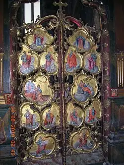 In the time after the year of 1440, after the church had been given to the Serbs, the harmonious and proportionate Gothic building ( with the chapels ) was, with minor interventions, turned into the Orthodox oratory. The eastern aisle, trigonously completed, was renovated and converted into the altar area of appropriate size. Without a doubt, the original iconostasis in the obtained church was a low altar screen with a small number of icons brought from Kovin in Banat. Today's iconostasis with a smaller number of icons dates from 1770. Only four main icons were painted earlier, in 1746, and present the work of unknown Russian and Ukrainian masters. Other icons, including those in unusual places below the main ones, belong to the masters from Moshopolis. This "developed" altar screen has several horizontal zones. The first is a parapet one and unpainted. The second comprises the Royal Doors with 14 medallions of Prophets, side doors with icons above them and finally the main icons with the elongated medallions in the foot. In the final fourth zone there are the cross with the crucifixion, two associated icons and the icons of Apostles in the carved frames.[1]