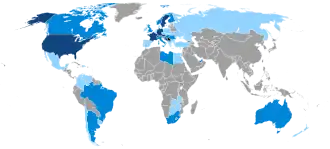 The main countries of destination were Germany, Austria, the United States, Sweden, Canada, and Australia.[2] Based on a 2007 estimate, there were 4.2 to 5.8 million Serbs or people of Serbian origin in the diaspora.[3] The Ministry of Diaspora (MoD) estimated in 2008 that the Serb diaspora numbered 3,908,000 to 4,170,000, the numbers including not only Serbian citizens but people who view Serbia as their nation-state regardless of the citizenship they hold; these could include second- and third-generation Serbian emigrants or descendants of emigrants from other former Yugoslav republics who never obtained Serbian citizenship but are ethnic Serbs.[3] By continent or region, it was estimated that 2,705,000–2,765,000 lived in Europe (excluding former Yugoslavia), 1–1,2 million in North America, 130,000 in Australia, 26,000 in Africa, 20,000 in Central and South America, 8,000 in Asia, 5,000–7,000 in New Zealand, 5,000 in the Middle East.[4] There were c. 1,000 diaspora associations, registered in 191 countries.[1]