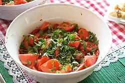 Serbian salad (Serbian: Српска салата / Srpska salata) is a vegetable salad, usually served during summer with roast meat and other dishes.[1] It is made from diced fresh tomatoes, cucumber and onions, usually seasoned with sunflower oil or olive oil, salt and commonly with a variety of hot pepper similar to cayenne pepper and called feferon. It is similar to the traditional salads of other Balkan countries and the Eastern Mediterranean, such as shopska salad, Greek salad, Arab salad, and Turkish shepherd's salad.