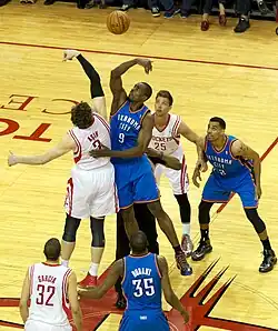 In August 2012, Ibaka signed a four-year deal worth $48 million with the Thunder.[19] During the 2012–13 NBA season, Ibaka upped his scoring average from 9.1 to 13.2. Ibaka also averaged 7.7 rebounds, and a league-leading 3.0 blocks. For his defensive efforts, Ibaka finished third in Defensive Player of the Year voting, behind LeBron James and the winner, Marc Gasol. In the playoffs, the Thunder beat the Houston Rockets in six games but fell to the Memphis Grizzlies in five games. Ibaka averaged 12.8 points, 8.4 rebounds, and 3.0 blocks in the postseason but shot only 43.7% from the field, a near 14% drop off from his regular season field goal percentage of 57.3%.