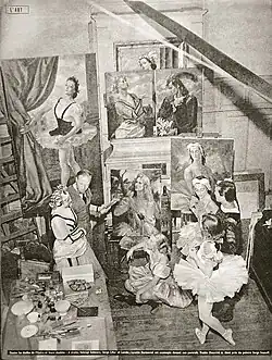 He produced reportage drawings, such as these series of paintings representing the Hôtel Drouot[5] or these watercolors presenting the Cathedrals of France, of which the Musée Carnavalet acquired several pieces in 1988. He designs stage costumes and theater sets. His Haute couture representations (Schiaparelli, Molyneux, Rochas, Patou) made the cover of fashion magazines. Van Cleef & Arpels commissioned a portrait from him for the New York Exhibition in 1939,[6] depicting a model wearing jewelry from the "Passe-Partout" collection.[7]