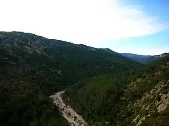 The northern slopes of the Serra del Turmell are covered with Mediterranean forest of holm oak and pine, while the southern slopes are almost denuded of vegetation with the grey limestone rocks exposed among scattered clumps of shrub.[4] There are large prey birds such as the griffon vulture, as well as wild animals such as the Spanish ibex, roe deer and wild boar.
