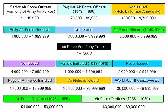 The service numbers 50 000 000 to 59 999 999 were used by Air Force draftees between 1948 and 1966. These numbers were issued in the same manner as the Army using the same geographical codes for the first two numbers. As with other service numbers used by both the Army and the Air Force, procedures were in place to avoid repeat or duplicate numbers.