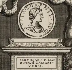 Isaurica was likely the same Servilia who was engaged to Octavian as a young girl, (although it is possible that that girl was actually a sister of hers, as all women who shared fathers had the same name in Republican Rome).[4] This was likely a politically motivated betrothal, since her father was one of Octavian's supporters and her mother, Junia Prima, was a sister-in-law of the triumvir Lepidus (married to Junia Secunda), thus the marriage would have strengthened Octavian's bonds with the two. Nonetheless, he eventually rejected Servilia and married Claudia instead. Servilia's later union with Lepidus was possibly proposed by her mother and the triumvirs in an attempt to soothe any ill feelings created by Octavian's rejection.[5]