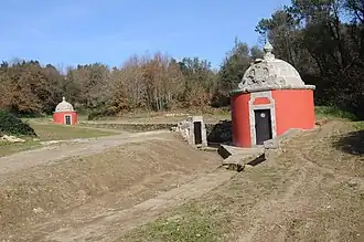 The more prominent features of this system, are the commonly referred to as Mães de Água ('Mothers of Water').[2] These structures are built in Baroque style, consisting of a cylindrical structure and vaulted dome, trimmed by a circular cornice and topped with pinnacles.[1][2] Each Mães de Água is decorated with a coat of arms representing its patron.[1][2][29][30] Although rarely used in their identification today, the Mães de Água include (from the highest elevation): Mina do Dr. Amorim (1752), Mina do Dr. Nozes, Mina do Dr. Sampaio, Mina dos Órfãos (1804), Mina das Freiras, Mina do Dr. Alvim (de cima), Mina do Dr. Alvim (de baixo) (1744), Mina Preta, Mina das Verdosas 1, Mina das Verdosas 2 (destroyed in 2011) and Mina de Xedas/Chedas and Mina de Adelino Correia (destroyed in 1995). There are also two untitled cylindrical structures, breathers (Portuguese: respiros), near the Mina dos Órfãos and Mina das Freiras.[1][2]