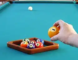 At the start of the game, balls one through seven are racked in a hexagonal configuration, with the 1-ball placed at the rack's apex, centered over the table's foot spot, the 7-ball placed at the rack's center, and all other balls placed clockwise (see photo top right). Immediately following the break shot, the opponent must elect three pockets along one of the table's long rails, and the player who broke is automatically assigned the three pockets situated along the opposite long rail. Once that selection is made, balls 1–6 may be pocketed in any pocket in rotation, starting with the one, as the object ball. Balls pocketed via combinations off of the object ball are legal. The 7-ball must be pocketed in player's assigned side to be a legal win. Scratches on any object ball allow the opponent ball-in-hand, but the sunk ball remains potted. Scratching on the 7-ball is a loss. Pocketing the 7-ball in any other pocket than one on the called side is a loss.[2]