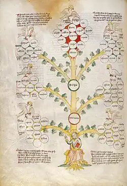 The seven gifts were often represented as doves in medieval texts and especially figure in depictions of the Tree of Jesse which shows the Genealogy of Jesus. For Saint Thomas Aquinas, the dove signifies by its properties each gift of the Holy Spirit.[14]