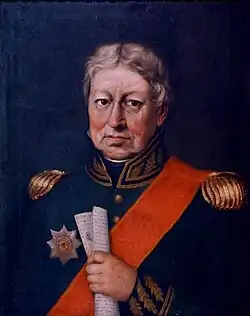 The first major military operation was against Lefkada, in April 1810, where Greek auxiliaries under Theodoros Kolokotronis and the British major Richard Church played a particularly important role. Despite strong French resistance, the garrison surrendered on 16 April.[66] On 29 May 1810, on the Paxoi islands a pro-British uprising broke out. The rebels evicted the small French garrison, raised the British flag, and attacked French sympathizers on the islands. However, British troops failed to arrive, and the French in Corfu quickly suppressed the uprising.[66] The British established a Governor-General in Zakynthos (General Oswald until 1810, General George Airey until 1813, and General Sir James Campbell after). Each island was governed by a Governor with a five-member Executive Council, and a local legislative assembly, the Administrative Body.[66] While the British-controlled islands returned to normality, the French-held islands of Corfu and Paxoi, under Donzelot and Imperial Commissioner Mathieu de Lesseps, suffered from the effects of the British blockade, which became official on 10 November 1810.[68]