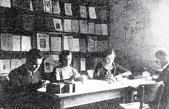 Pușcariu's institute was headquartered in a 26-room building in western Berlin, endowed with furniture of the highest quality ordered by Pușcariu and hosting large receptions attended by politicians and cultural figures. For instance, Education Minister Bernhard Rust paid a visit lasting over six hours in July 1942. Pușcariu held forth on the topic of Romanians' continuous presence in the Danubian space, particularly in Transylvania, and according to an internal memorandum, the visit ended with "exceptionally cordial" remarks toward his country.[112] Pușcariu, in writings and interviews, made flattering remarks about the Nazi regime, calling it "a new chapter in world history" and "a new world, a new era in the life of the German state". Nazi Party figures were invited to receptions, including one in 1941 to commemorate Moța and Marin.[113]