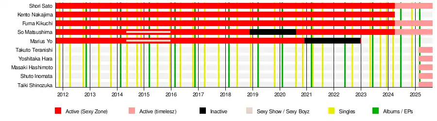 Timelesz (stylized as timelesz, formerly known as Sexy Zone)[1] is an eight-member Japanese boy band managed by Starto Entertainment (formerly of Johnny & Associates).[2]