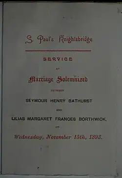 On 15 November 1893, Bathurst married the Honourable Lilias Margaret Frances Borthwick,[1] only daughter of Algernon Borthwick, 1st Baron Glenesk, owner of The Morning Post and his wife Alice Beatrice Lister, daughter of the novelist Thomas Henry Lister, and his wife Maria. They had four children:[2]