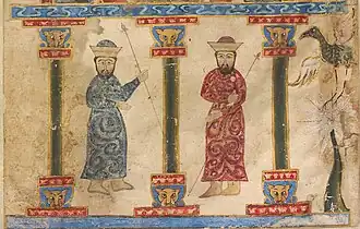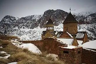 Two princedoms – the Orbelians and Proshians[79] (Khaghabakyans) (formerly the Zakaryans' vassals) – were formed there after the region's liberation.[82] The founders of those dynasties received their possessions for merits in the war against the Seljuks. The Orbelians in Syunik traced their ancestral roots to Liparit, Elikum's son, while Vasak[71] descended from the from Khakhbakyan dynasty who came from the neighboring Armenian region of Khachen.[83] As recounted by Kirakos, a 13th-century historian, "They were natives of Khachen, people of noble origin. adherents of the Christian creed and Armenians by nationality".[84] Enthroned in Syunik, the Orbelians were among the influential princedoms of Armenia.[9] Their liberation from the Seljuk hegemony contributed to the cultural development of the district.[85] The Proshyans extended their authority mainly to the Gavars of Gegharkunik in the south-west of Lake Sevan, and Vayots Dzor, holding their residence in the small city of Srkghunk.[86] In 1236, both dynasties were forced to recognize the Mongol authority over them (after the latter's invasion of Armenian lands).[87] In 1251, Smbat Orbelian obtained the right inju[88][89][90] from the Mongol royal palace. Those rights were retained also by Hulagu Khan and his successors.[73] The lands under Stephen Orbelyan's control extended to the borders of Nakhichivan[9] and those owned by the younger branch of the princedom covered the shore of Sevan.[9][91] Thanks to the rulers, as well as the right to immunity, the conditions in that part of Armenia were relatively tolerable, which in turn promoted economic and cultural life across the region.[73] A glaring example is the most prominent institution of higher learning of the time, the University of Gladzor, which functioned here.[91][73] Meantime, the region also became the main stronghold of the national and state establishment across the entire territory of historical Armenia[90][92] where the Armenian state anatomy was still preserved.[93][94]