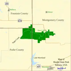 Shades State Park is a state park in Montgomery, Parke, and Fountain Counties in Indiana. It is located 47 miles (76 km) west-northwest of Indianapolis, Indiana. In 2018–2019, Shades received nearly 87,000 visitors.[2]