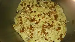 Shahi Tukra is type of bread pudding which originated in South Asia during the Mughal era in the 1600s.[1][2] The literal translation of Shahi Tukra is royal piece or bite.[1] Shahi tukre originated in the Mughal Empire when Indian chefs made this dish to present to royal Mughal courts.[3] The white bread is fried in oil/ghee after which milk and sugar is added.[4][5] The dish is flavored using saffron, cloves, and cardamom.[6][7] It is akin to the Egyptian dessert Om Ali.[8]