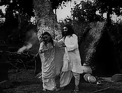 Reduced to destitution, Harishchandra pledges to pay an additional sacrificial fee within a month. During this period of hardship in Varanasi, Shaivya remains unwavering in her support of Harishchandra. Witnessing his despair, she encourages him to remain devoted to truth, which she regards as the highest form of righteousness. In a profound act of loyalty and self-sacrifice, Shaivya volunteers to be sold to enable her husband to fulfil his vow. Harishchandra, devastated by the suggestion, breaks down, and Shaivya comforts him with dignity and resolve. Soon after, Vishvamitra arrives to demand immediate payment. Left with no alternative, the family proceeds to the market in Varanasi, where Harishchandra auctions Shaivya. She is purchased by a cruel and elderly Brahmin as a housemaid and is dragged away by her hair. Seeing her devasted son following her, Shaivya pleads with the buyer to purchase her son, Rohitashva, as well, so they are not separated. The Brahmin reluctantly agrees. Despite the cruelty and humiliation she endures, Shaivya maintains her composure, offering comfort to her weeping son even as she suffers herself.[9][10]