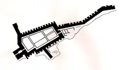 The fortress occupies a roughly triangular area of about 1,800 square metres (0.44 acres), adapted to the available ground. Its massive mudbrick wall still stands up to 6 metres (20 ft) high and 8 metres (26 ft) thick. Three spur walls, towards the north, west and east, complete the fortification system. The eastern wall protects a stairway leading down to the river to ensure access to a water supply in the case of siege.[3] The internal structures are very well preserved, including a command building, barracks, workshops, storerooms and a granary arranged in a grid plan.[4]