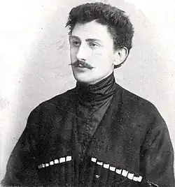 His first collection of poems appeared in 1892, followed by a series of short stories published in the magazine Iveria in the late 1890s. Dadiani began his theatrical career in 1893 and quickly became a close collaborator of Lado Aleksi-Meskhishvili at the Kutaisi Theatre. In 1908, he formed Modzravi Dasi (“Mobile Troupe”), a peripatetic theatre of revolutionary propaganda, which toured in various cities of Georgia, as well as Baku and Novorossiysk, and staged, among others, Maxim Gorky’s The Last, a play censored by the Russian authorities. Dadiani, as a playwright, emerged during the 1905 Russian Revolution, heavily influenced by the works of Gorky. At the same time, Dadiani engaged in historical prose in the patriotic traditions of Vasil Barnovi, and authored the memorable George the Rus (გიორგი რუსი; 1916–26), dedicated to Yury Bogolyubsky, the dishonored and ousted 12th-century Rus' consort of Georgia. After the establishment of Soviet rule in Georgia (1921), Dadiani’s works were either tacitly hostile to the new regime, or remained apolitical. However, Dadiani never let his narrative ingenuity endanger his future by oppositionist writings, and his later novels and plays glorified Soviet premier Joseph Stalin.[1]