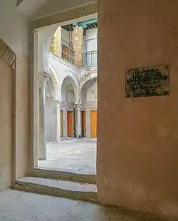 From the street, a staircase climbs to the entrance where a bent passage leads to a central square courtyard. Across the courtyard, opposite the entrance, is a small vaulted prayer hall. In the middle of the other two sides of the courtyard are vaulted rooms, entered through large arches, which were probably classrooms. A second floor exists, with a gallery around the courtyard leading to 19 small bedrooms for students. A second, larger prayer hall is also found on the upper floor, directly above the ground floor prayer hall.[2][1] The layout, in which the entrance and major rooms of the ground floor are aligned symmetrically with the two central axes of the building, may have been inspired by the layout of madrasas in Egypt or further east. It also resembles the layout of traditional houses in the medina of Tunis,[2] and the building may have been a former house that was remodeled and repurposed into a madrasa.[5] Due to its later renovations, none of the madrasa's original decoration, if it had any, has survived.[2]